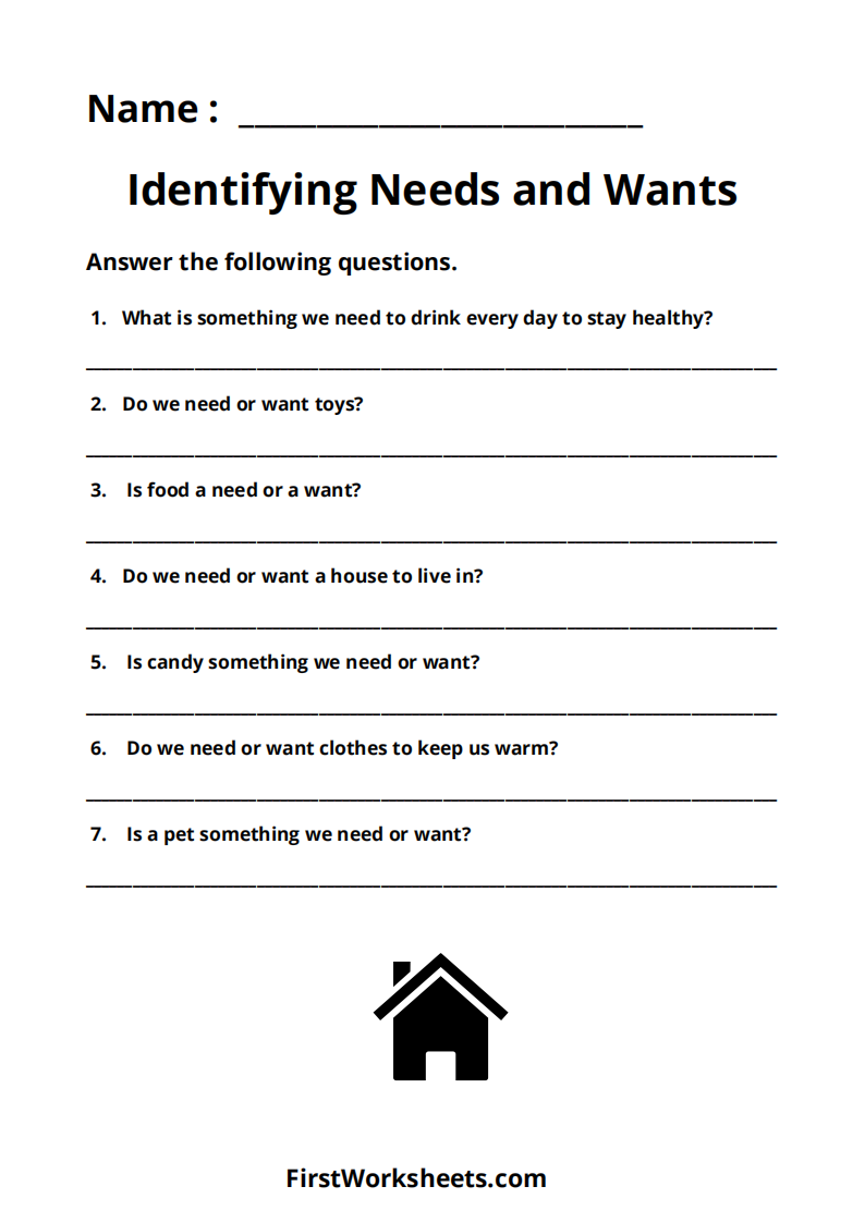 - Real-Life Scenarios: Worksheets may ask children to think about situations where they have to choose between a need and a want (e.g., “If you had $10, would you buy a toy or food? Why?”).